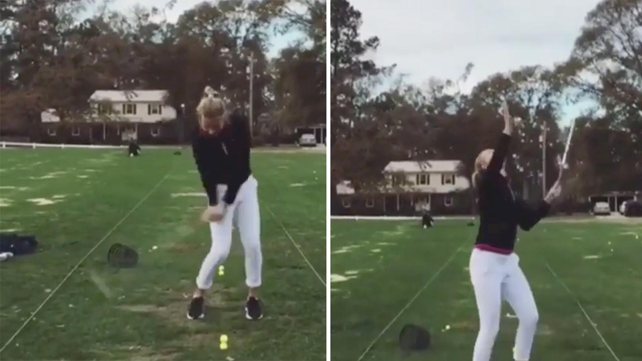 En kvinna har placerat en boll ovanpå en undre boll, för att sedan slå ett fullt slag. Det här gör att den övre bollen flyger rakt upp i luften och när kvinnan sedan försöker fånga bollen – sker det oväntade.