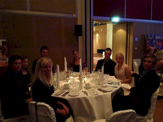 Ikväll har vi varit på en galamiddag som höll på nästan till midnatt. Vi blev presenterade av Suzann och Annika på scenen inför runt 250 gäster och mottog lagdressen inför matchen.