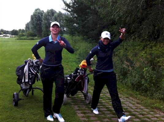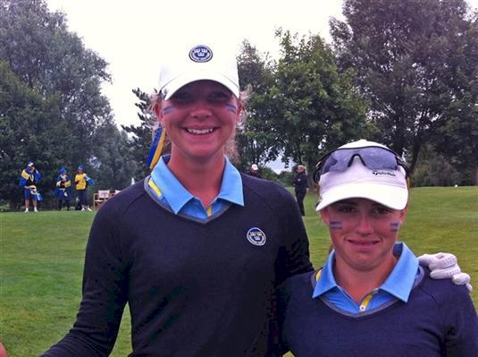 Bella och Elsa gör fem birdies och och vinner på 18:e mot Bronte Law och Emily Taylor.