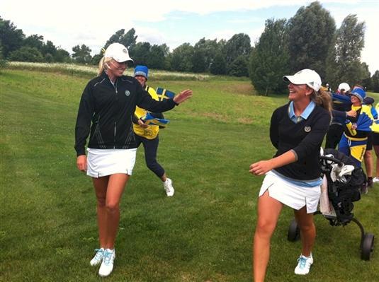 Linn och Linnea gör fyra birdies och vinner på 19:e mot Charley Hull och Georgia Hall.