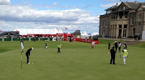 Sophie Gustafson har precis rullat i ytterligare två birdies, på hål 9 och 10, och är -1 totalt. Ovan kan ni se Sophie (nere t v i bild) träna puttning på 18:e green under onsdagens inspelsvarv.