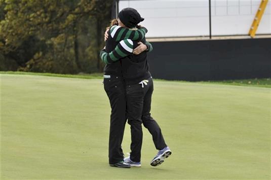 När USA även utjämnade den sista av foursomematcherna på 17:e och satt press på Suzann och Sophie på sista genom att sätta upp inspelet till 2 meter, då visade de nordiska tjejerna att de inte backar för någon eller något. Sophie sätter inspelet 1 meter från hål och Suzann hålar putten efter att Inkster missat USA birdieförsök. Poäng Europa och 2-2 inför eftermiddagen.