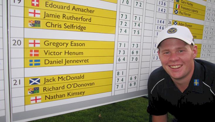 Han ryckte tidigt. Redan efter tävlingens första arton hål hade Högbo GK:s Daniel Jennevret en komfortabel ledning över resten av fältet. Under torsdagen följde han upp gårdagens tangerade banrekord med ännu en bra runda, denna gång skrevs slutresultatet till 70 slag (-2). Det blev ömsom birdie ömsom par under de inledande nio hålen, på väg in mot mål bättrades spelet på då han gick på -3. Ledningen har Högbospelaren således ännu ett grepp om, totalt ligger han på -10 efter två dagars spel. Strax bakom jagar dock närmast en duo bestående av dansken Sørensen och portugisen Pinto, de båda har ett slag upp till den ledande svensken.