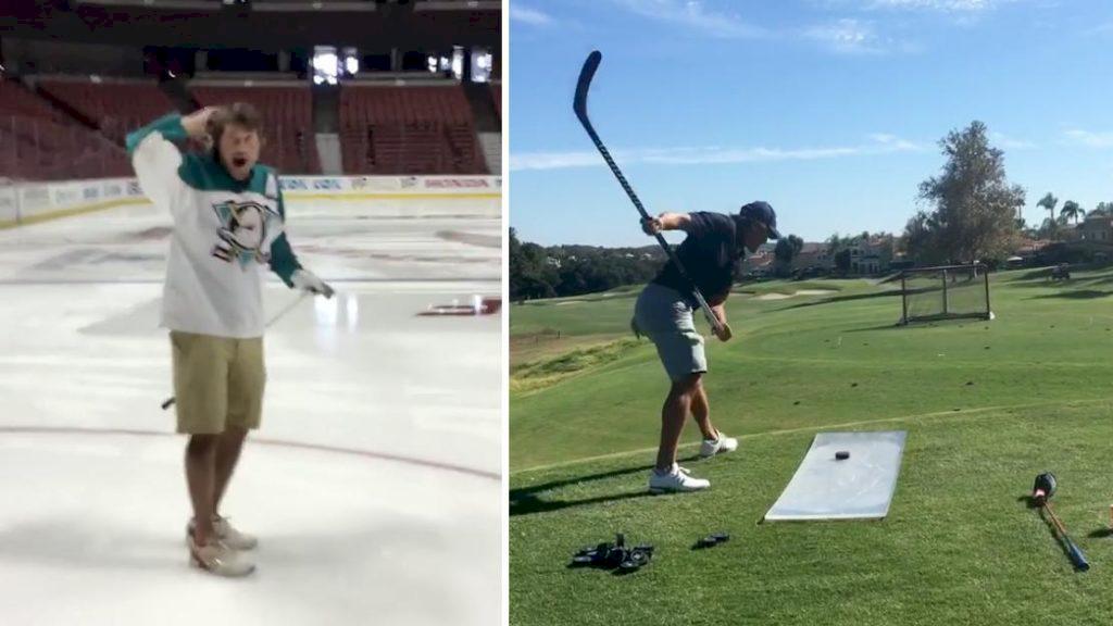 Finske hockeylegendaren Teemu Selänne spelar golf i sin gamla hemmahall, sedan spelar han hockey på golfbanan.