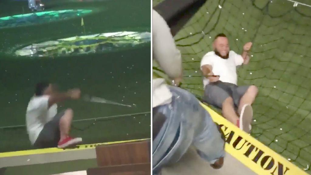 Det kan vara farligt att spela golf. Ännu värre är det när man tränar på en av de övre våningarna på en range. Som tur är gick det bra den här gången.