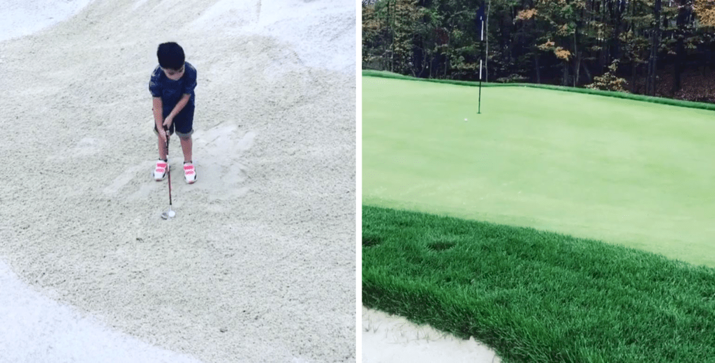 Pappa Jason Day filmade när 5-årige sonen Dash skulle slå ett bunkerslag. Se och njut!