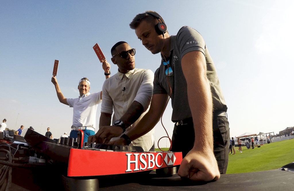 Under Abu Dhabi HSBC Championship spelar en discjockey musik på rangen och när stjärnspelarna gör entré på tee.