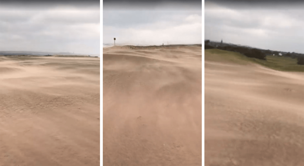 Stormen blåste in sand från stranden som förvandlade fairway till en enorm bunker.