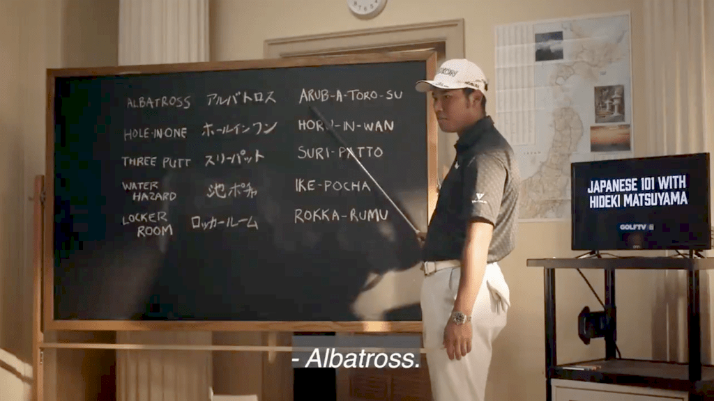 Tiger, Rory och Jason får sig en lektion i japanska av Hideki Matsuyama.