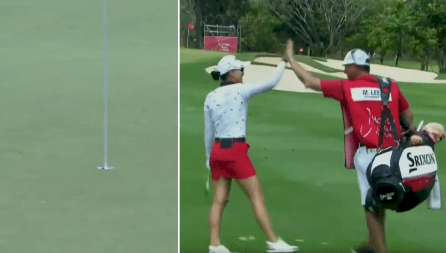 SLAM DUNK FOR EAGLE!@minjeegolf goes straight from the fairway to the cup for eagle on the #AonRiskReward Challenge Hole 15!